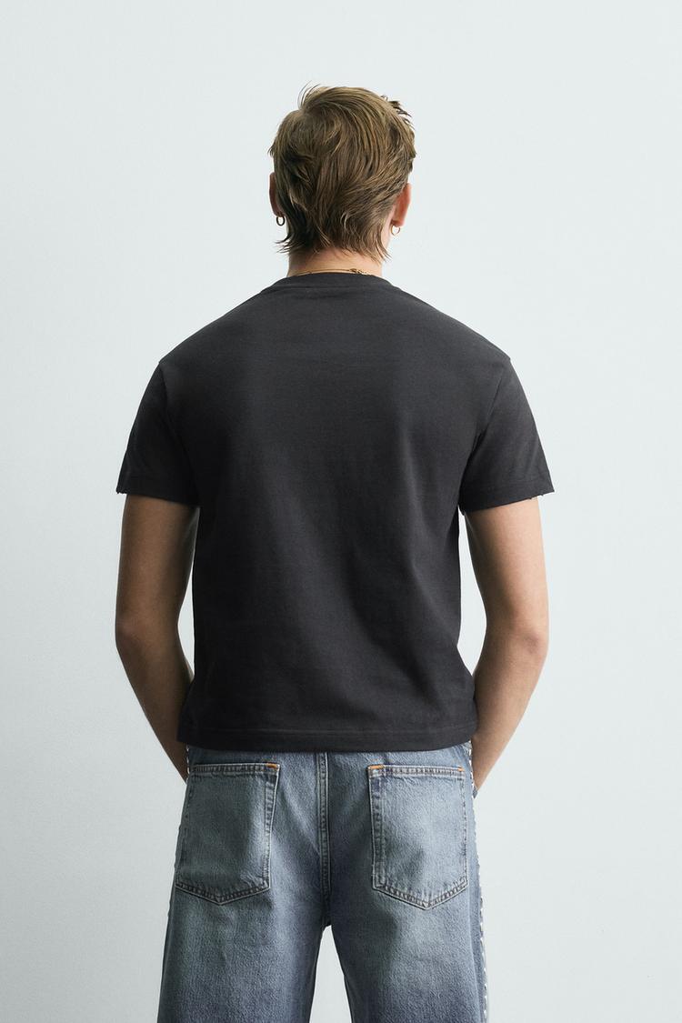 ZARA УКОРОЧЕННАЯ ФУТБОЛКА С НАДПИСЬЮ И ЭФФЕКТОМ ПОТЕРТОСТИ, АНТРАЦИТОВО-СЕРЫЙ