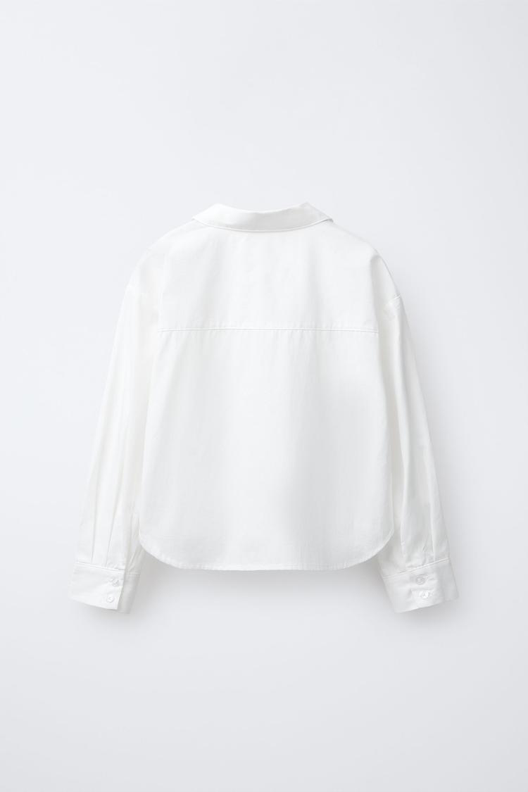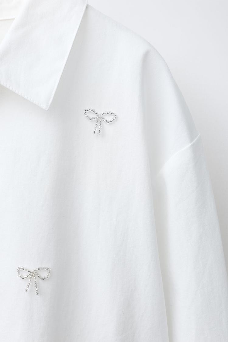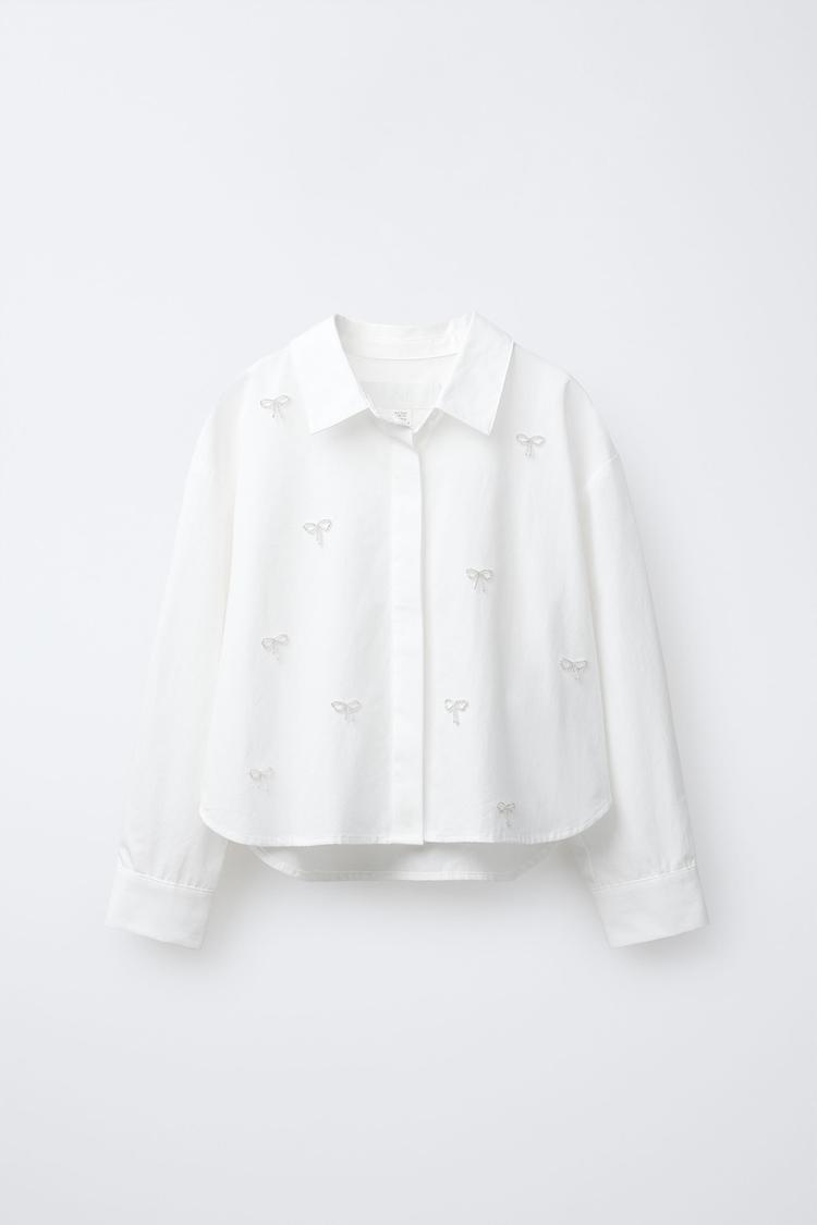 ZARA УКОРОЧЕННАЯ РУБАШКА С БАНТИКАМИ И СТРАЗАМИ, БЕЛЫЙ