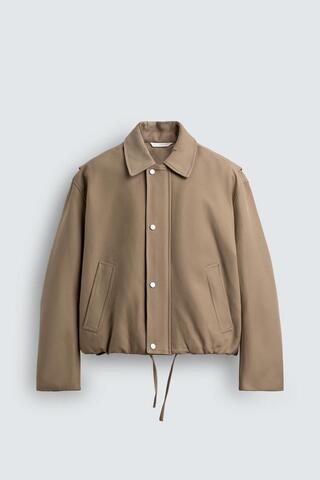Укороченная куртка из хлопка со слегка стеганой подкладкой. Воротник с лацканами и длинные рукава. Прорезные карманы на бедрах. Регулируемый низ на шнурке. Передняя застежка-молния скрыта под планкой с кнопками.