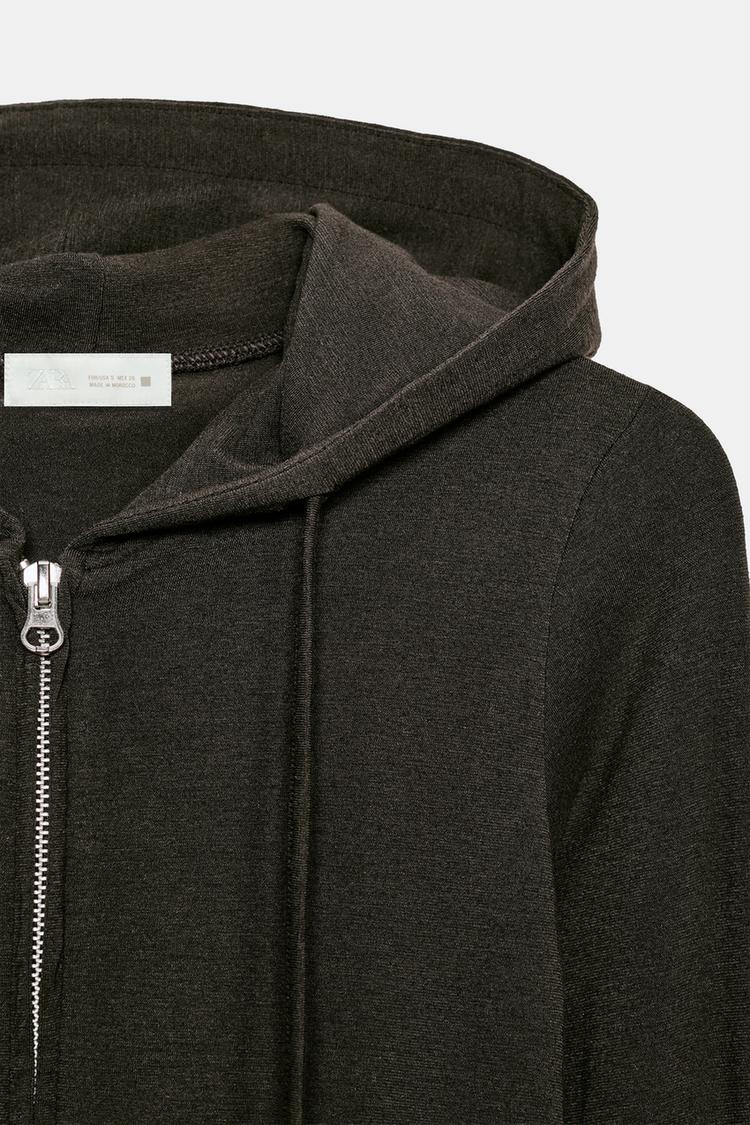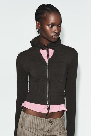 Толстовка с круглым вырезом и регулируемым капюшоном на шнурках. Длинные рукава. Отделка в рубчик в тон. Застежка-молния спереди.