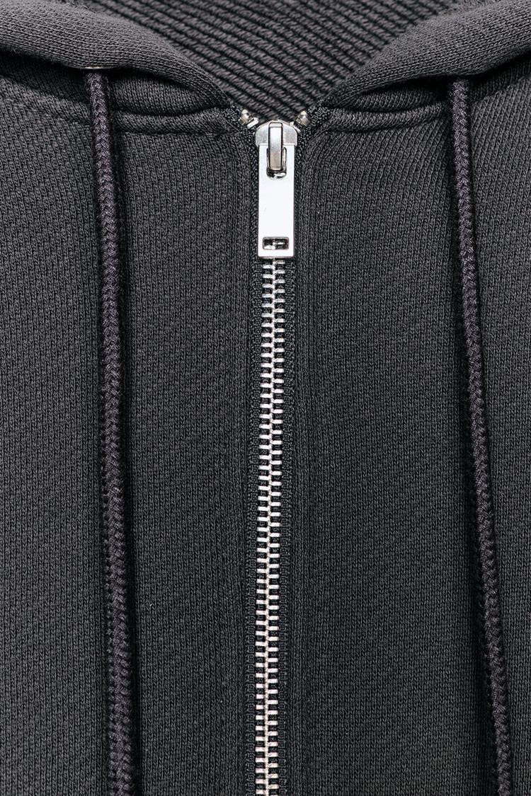 Укороченная толстовка из хлопка. Круглый вырез и регулируемый капюшон на шнурке. Детали в рубчик в тон. Застежка-молния спереди.