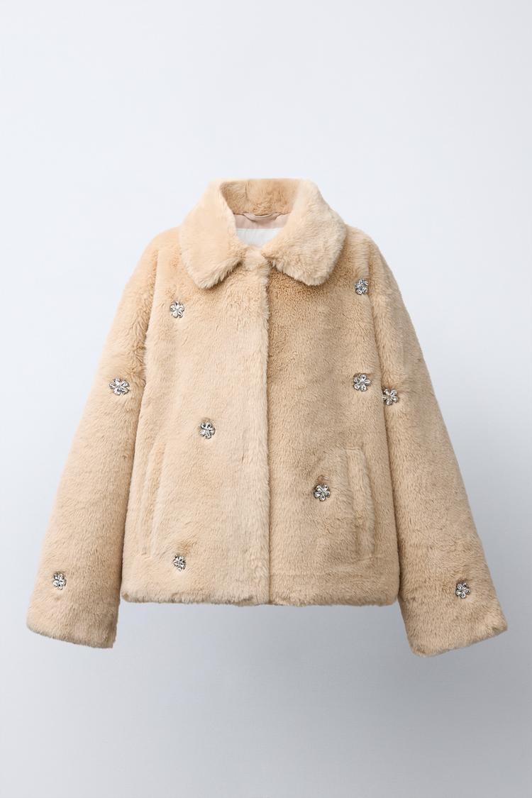 ZARA УКОРОЧЕННОЕ ПАЛЬТО ИЗ ИСКУССТВЕННОГО МЕХА СО СТРАЗАМИ, КАРАМЕЛЬНЫЙ