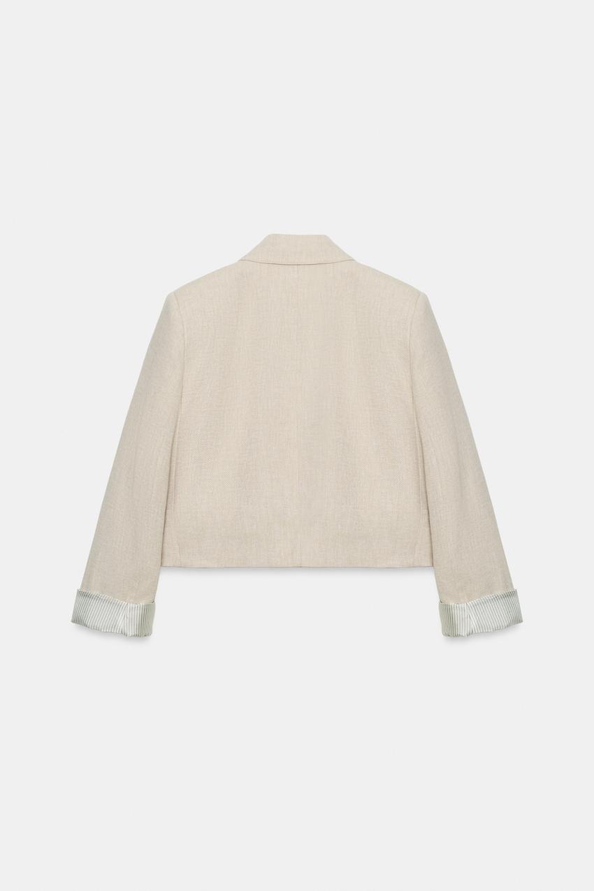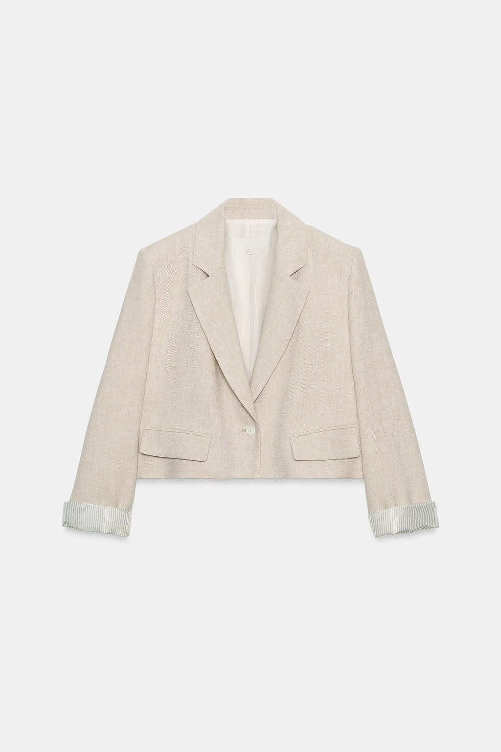 ZARA УКОРОЧЕННЫЙ БЛЕЙЗЕР ИЗ СМЕСОВОГО ЛЬНА С ПОДПЛЕЧНИКАМИ, СВЕТЛО-БЕЖЕВЫЙ