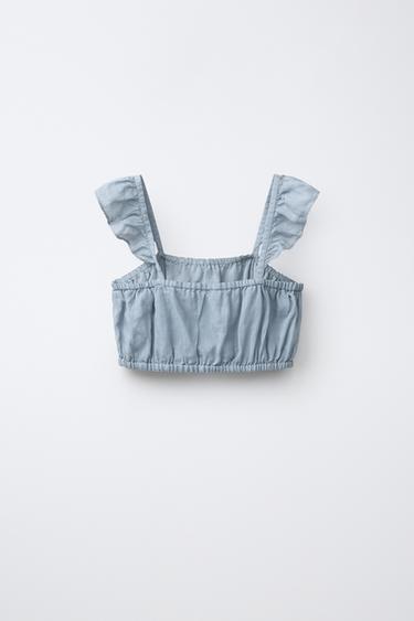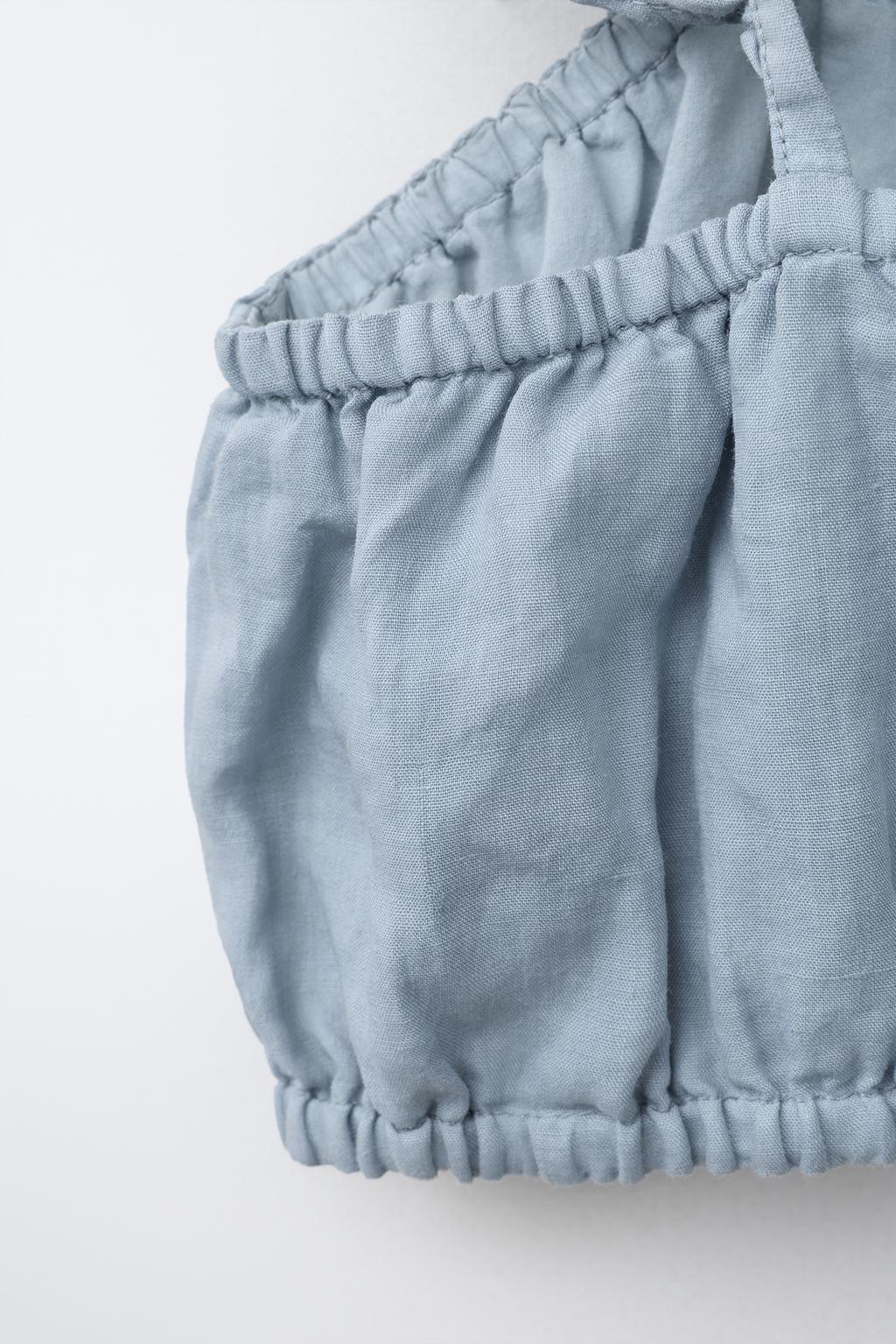 ZARA УКОРОЧЕННЫЙ ТОП ИЗ 100% РАМИ, СЕРО-СИНИЙ