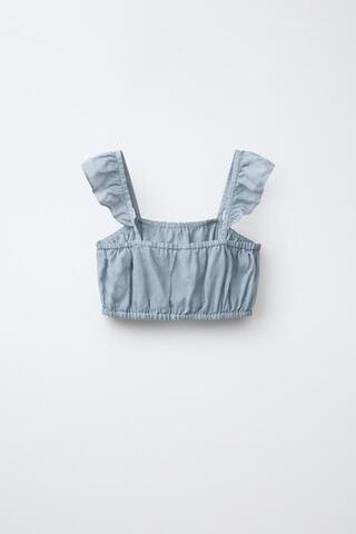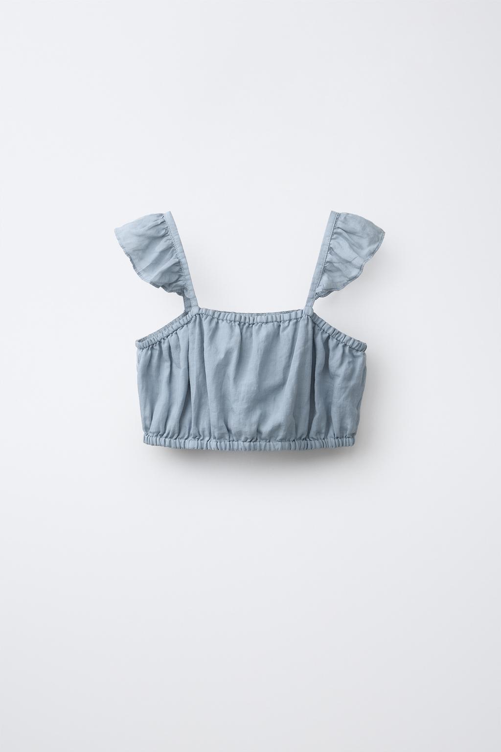 Топ с прямым вырезом, бретелями и оборками. Эластичные кромки. 100% рами.