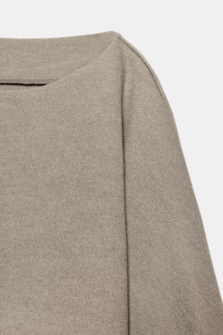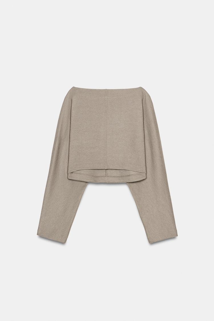 Укороченный топ с вырезом-лодочкой и длинными рукавами. Закругленный низ.
