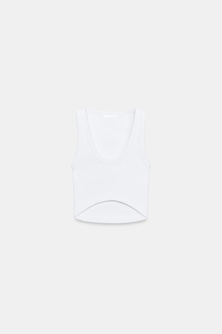 Укороченный топ из смесового хлопка. Круглый вырез и проймы. Ткань в рубчик. Асимметричный низ.
