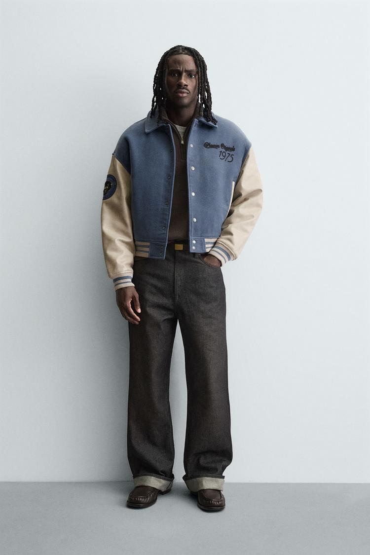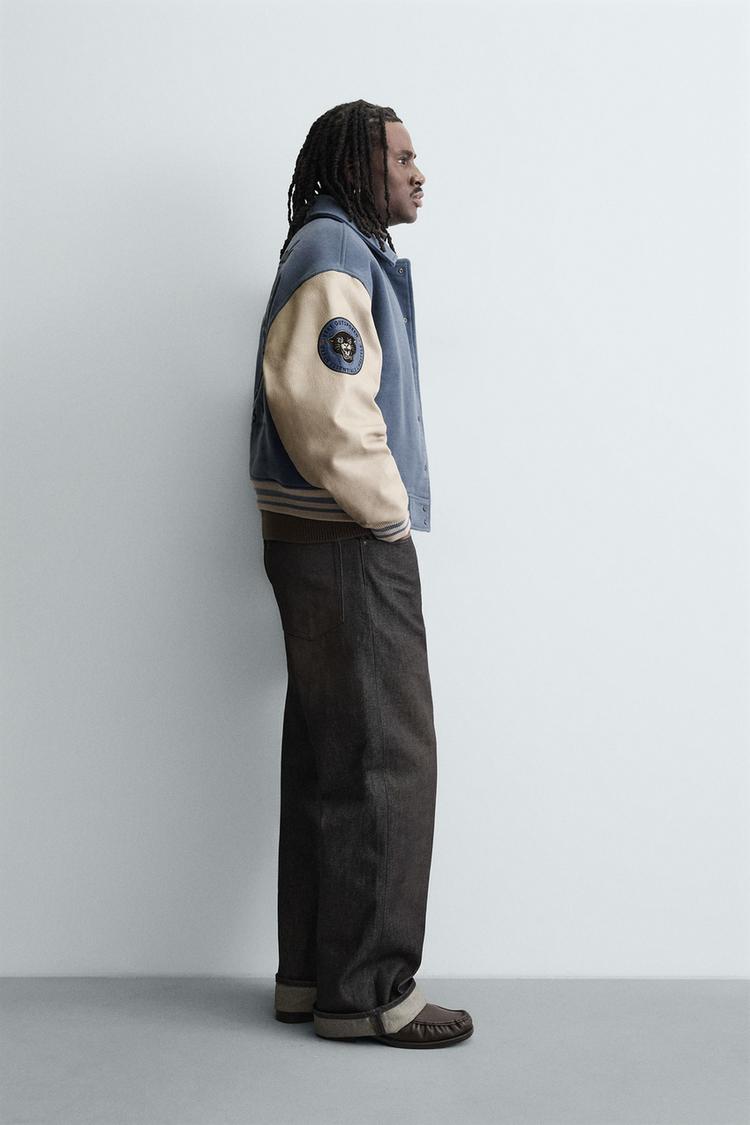 ZARA УТЕПЛЕННЫЙ БОМБЕР С НАШИВКАМИ, СЕРО-СИНИЙ