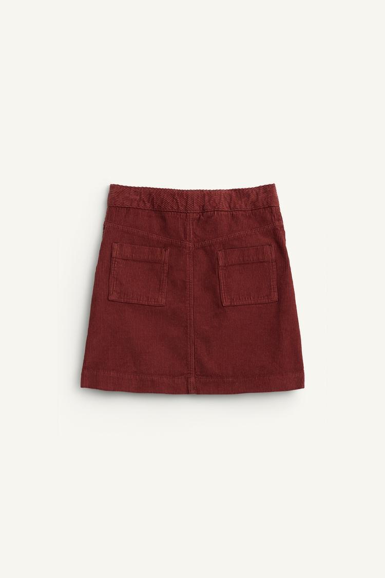 Вельветовая юбка с регулируемым потайным поясом и передними пуговицами. Передние карманы и накладные карманы сзади.
