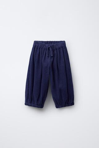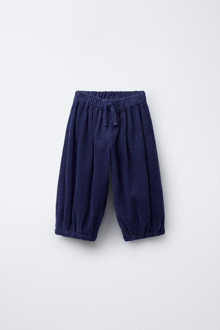 Вельветовые брюки-бомбашки с эластичным поясом и шнурком спереди.