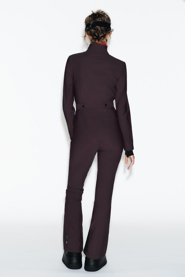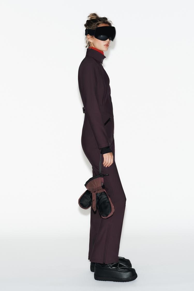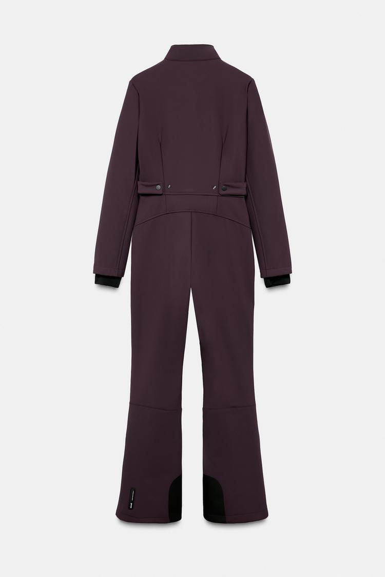 Глубокий воротник с подкладкой из эластичной резинки внутри. Рукава с длинными рукавами, карманом для ски-пасса и средством для чистки очков, а также манжеты с отверстиями для большого пальца. Регулируемые боковые подплечники на кнопках. Передние карманы на молнии. Регулируемые штанины с внутренней вставкой и молнией для предотвращения трения. Более длинный задний край спереди для размещения лыжных ботинок. Резиновая внутренняя манжета с липучкой и кнопками для фиксации обуви и предотвращения попадания снега и холода. Передняя застежка на молнии и кнопки.