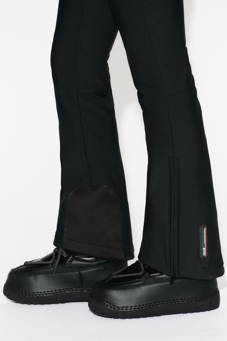 Высокий воротник с внутренней эластичной кулиской. Рукава с длинным рукавом, карманом для ски-пасса и чистящим средством для очков, манжеты с прорезиненным большим пальцем. Регулируемые боковые подплечники с кнопками-молниями. Передние карманы на молнии. Регулируемые штанины с заплатками и застежкой-молнией внутри для предотвращения трения. Задний подол длиннее спереди, чтобы соответствовать лыжным ботинкам. Резиновая внутренняя манжета с липкой лентой и кнопками-липучками для фиксации обуви и предотвращения попадания снега и холода. Передняя застежка на молнии и кнопки-липучки.