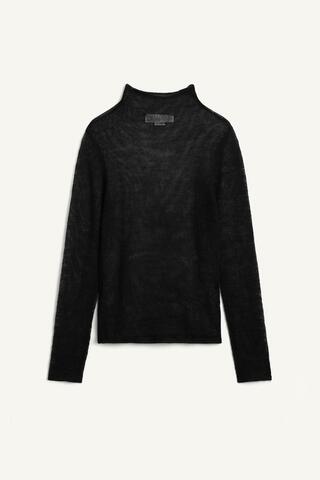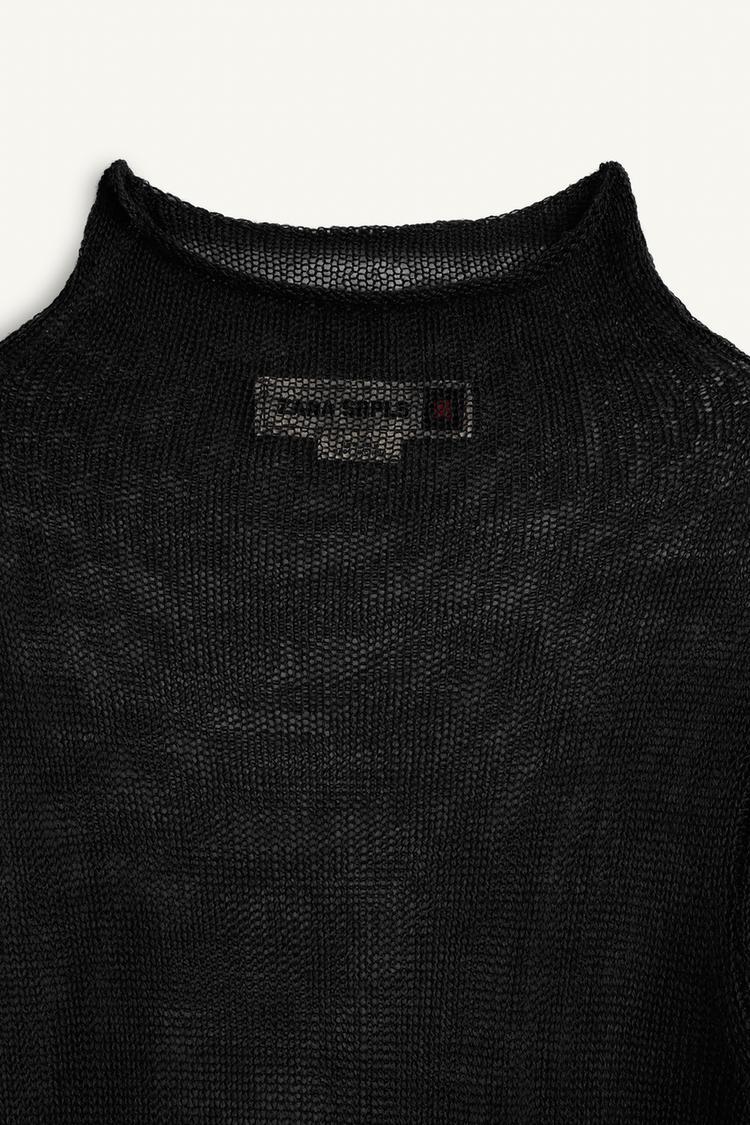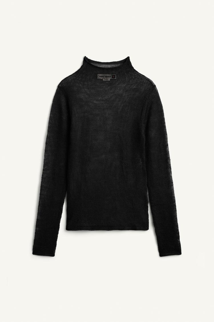 Свитер изготовлен из 30% шерстяной пряжи. Воротник-стойка и длинные рукава.