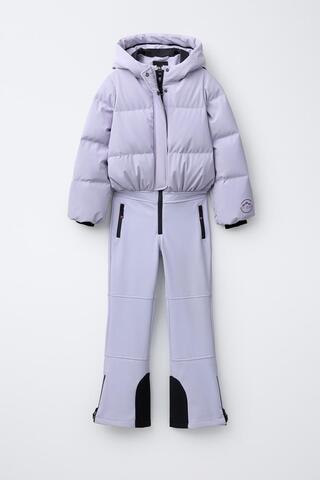 Длинный комбинезон с съемным воротником-стойкой из искусственного меха на молнии и на пуговицах-молнии. Рукава с длинными рукавами, резиновым краем и внутренними манжетами с прорезями для большого пальца. Детали кармана на молнии для ски-пасса. Теплоизолированная передняя молния, скрытая пуговицами-молниями и кнопками. Теплоизолированные передние карманы на молнии и внутренняя флисовая подкладка. Теплоизолирующая молния и штанины, заканчивающиеся эластичной внутренней манжетой, которую можно заправить внутрь обуви, чтобы предотвратить попадание снега и холода.