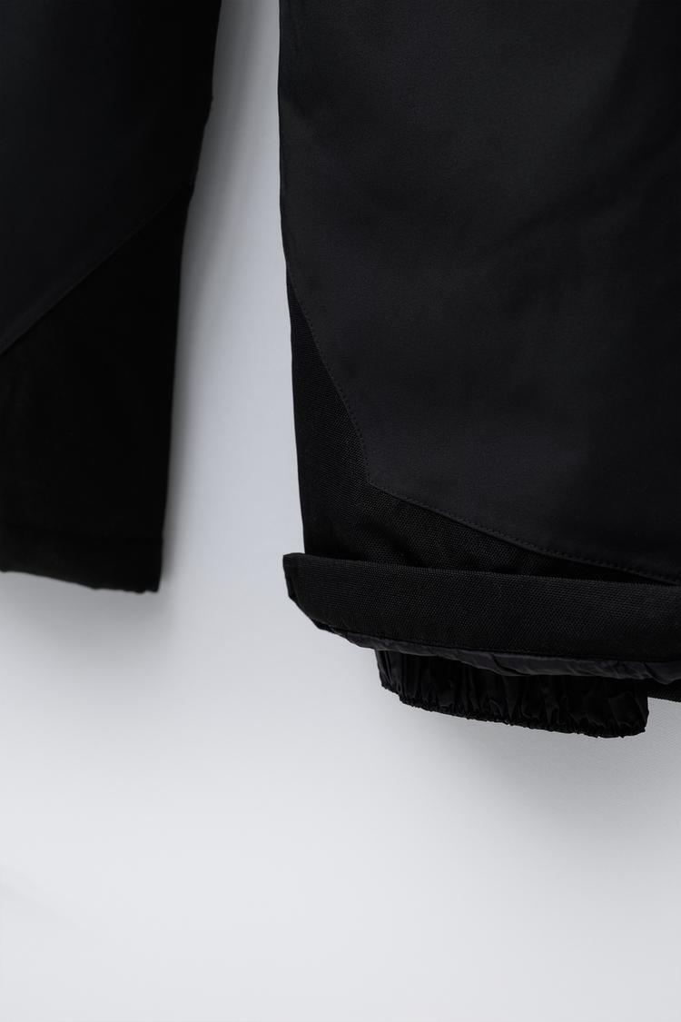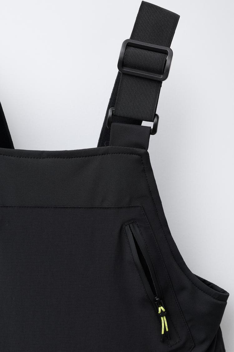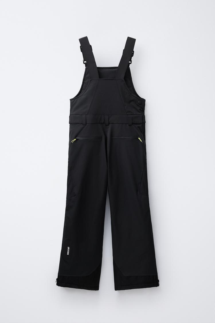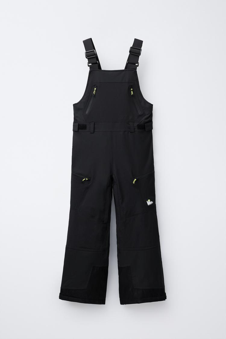 Комбинезон с высоким воротником и регулируемыми эластичными бретелями. Теплоизолированная застежка-молния сбоку и застежка-кнопка. Регулируемые ремни и пряжка на талии с клеем. Карманы с теплозащитными застежками-молниями на груди и спине, внутренняя подкладка из флиса спереди. Открытые отверстия на штанинах с сетчатой тканью для большей вентиляции. Утепленные штанины на молнии и эластичная внутренняя манжета, которую можно заправить в обувь, чтобы предотвратить попадание снега и холода. Логотип с отделкой в кармане. Детали с внутренней подкладкой.