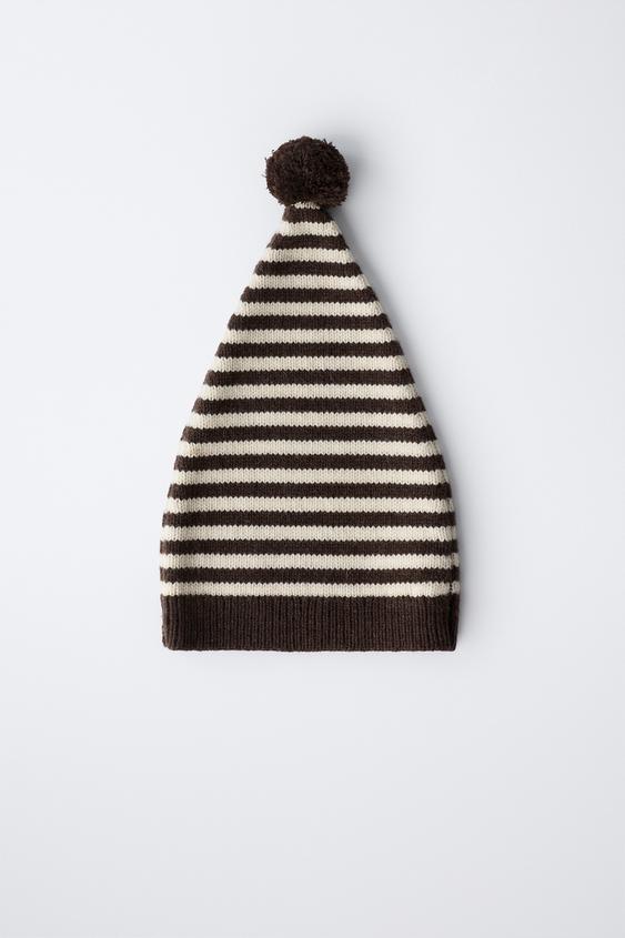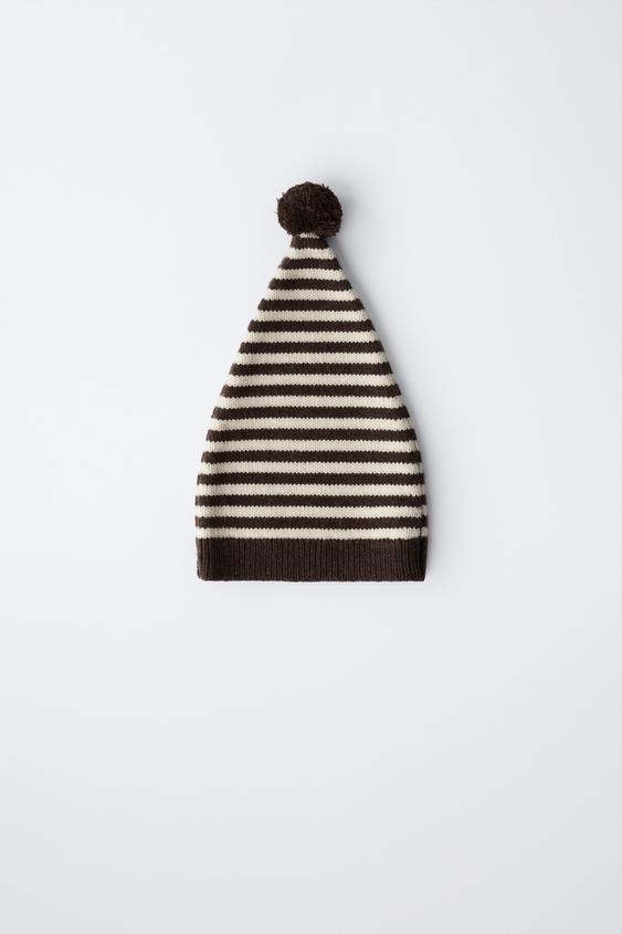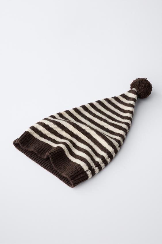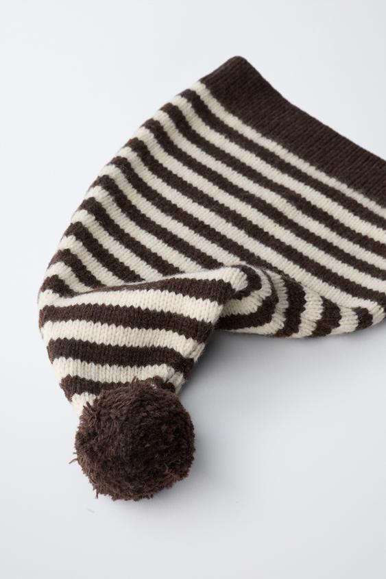 ZARA ВЯЗАНАЯ ШАПОЧКА В ПОЛОСКУ С ШЕРСТЯНЫМ ПОМПОНОМ, ЭКРЮ