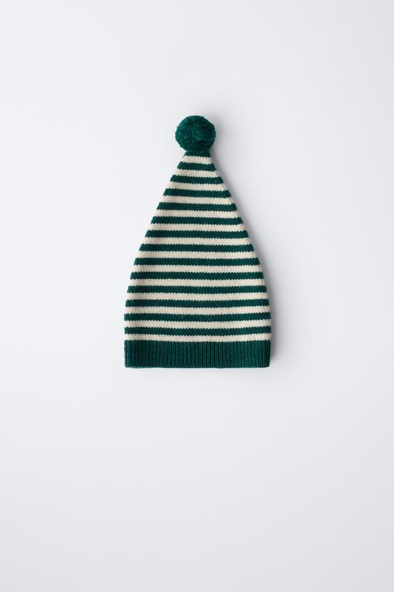 ZARA ВЯЗАНАЯ ШАПОЧКА В ПОЛОСКУ С ШЕРСТЯНЫМ ПОМПОНОМ, ТЕМНО-ЗЕЛЕНЫЙ