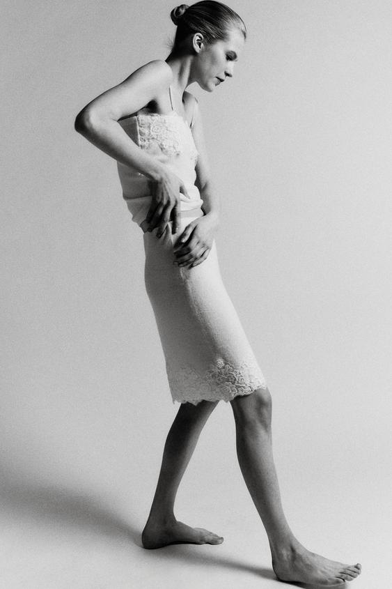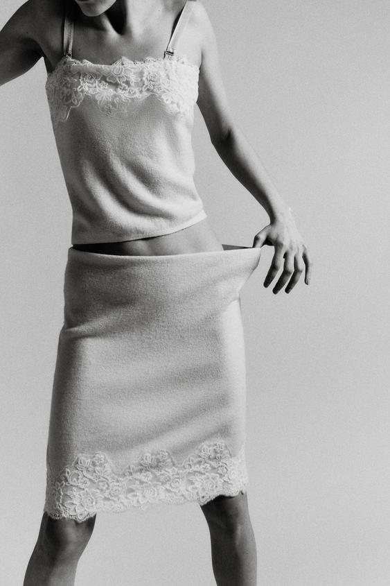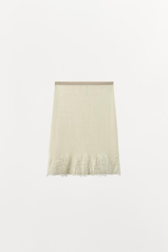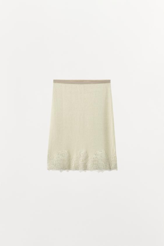ZARA ВЯЗАНАЯ ЮБКА МИДИ С КРУЖЕВОМ И ВЫШИВКОЙ, ЭКРЮ