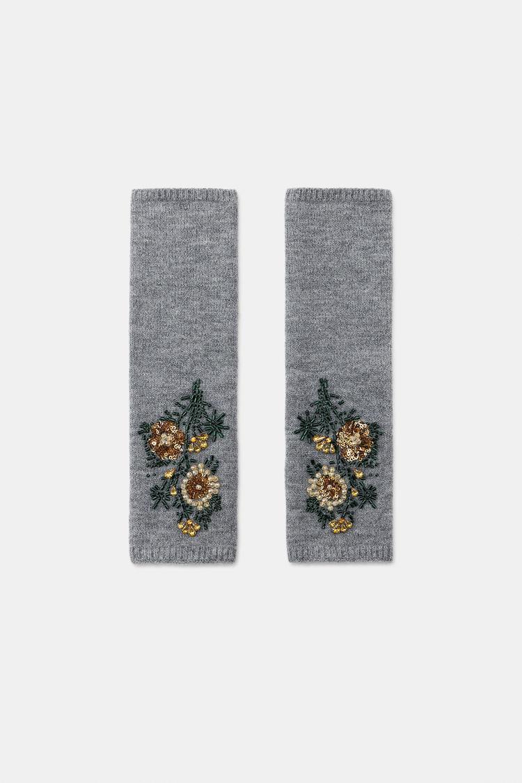 ZARA ВЯЗАНЫЕ МИТЕНКИ С ЦВЕТОЧНОЙ ВЫШИВКОЙ И БУСИНАМИ, СЕРЫЙ