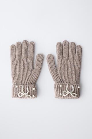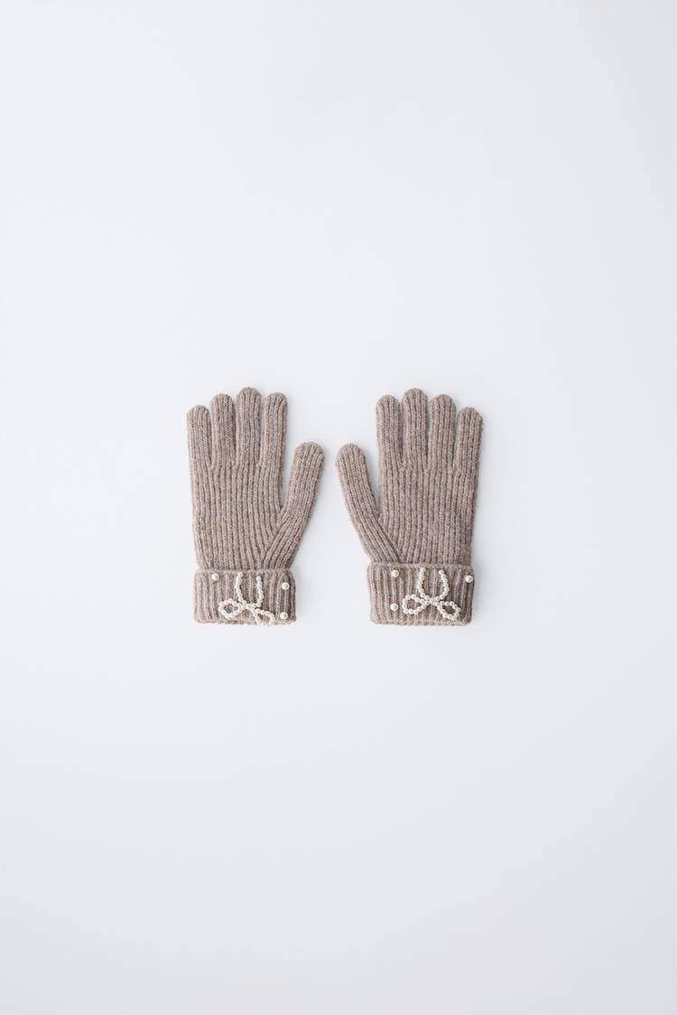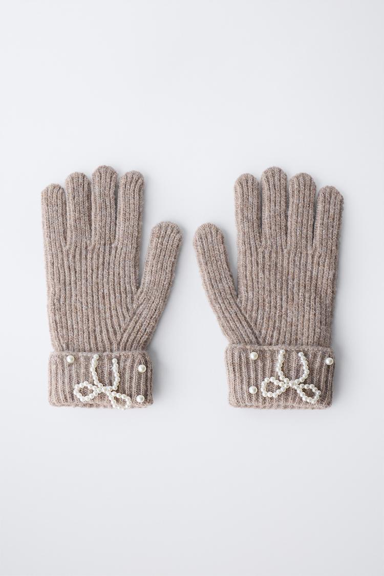 ZARA ВЯЗАНЫЕ ПЕРЧАТКИ С БУСИНАМИ, КОРИЧНЕВЫЙ МЕЛАНЖ