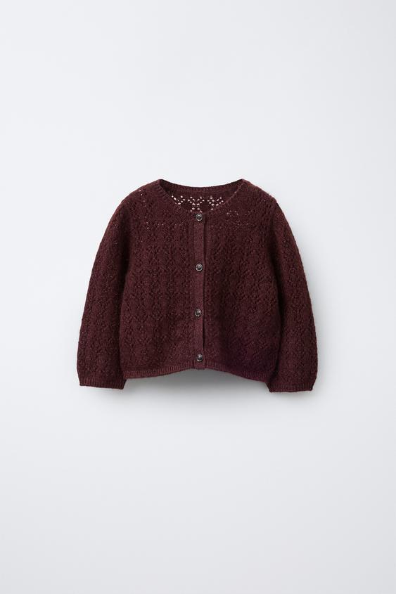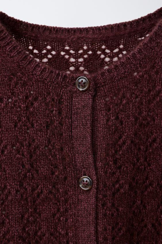 ZARA ВЯЗАНЫЙ АЖУРНЫЙ КАРДИГАН С КАШЕМИРОМ, БАКЛАЖАННЫЙ