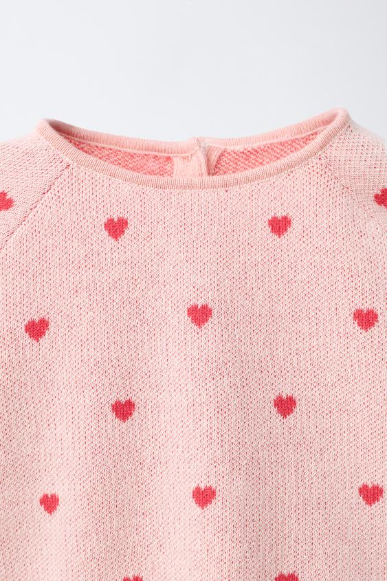 ZARA ВЯЗАНЫЙ ДЖЕМПЕР С ПРИНТОМ СЕРДЦЕ, РОЗОВЫЙ