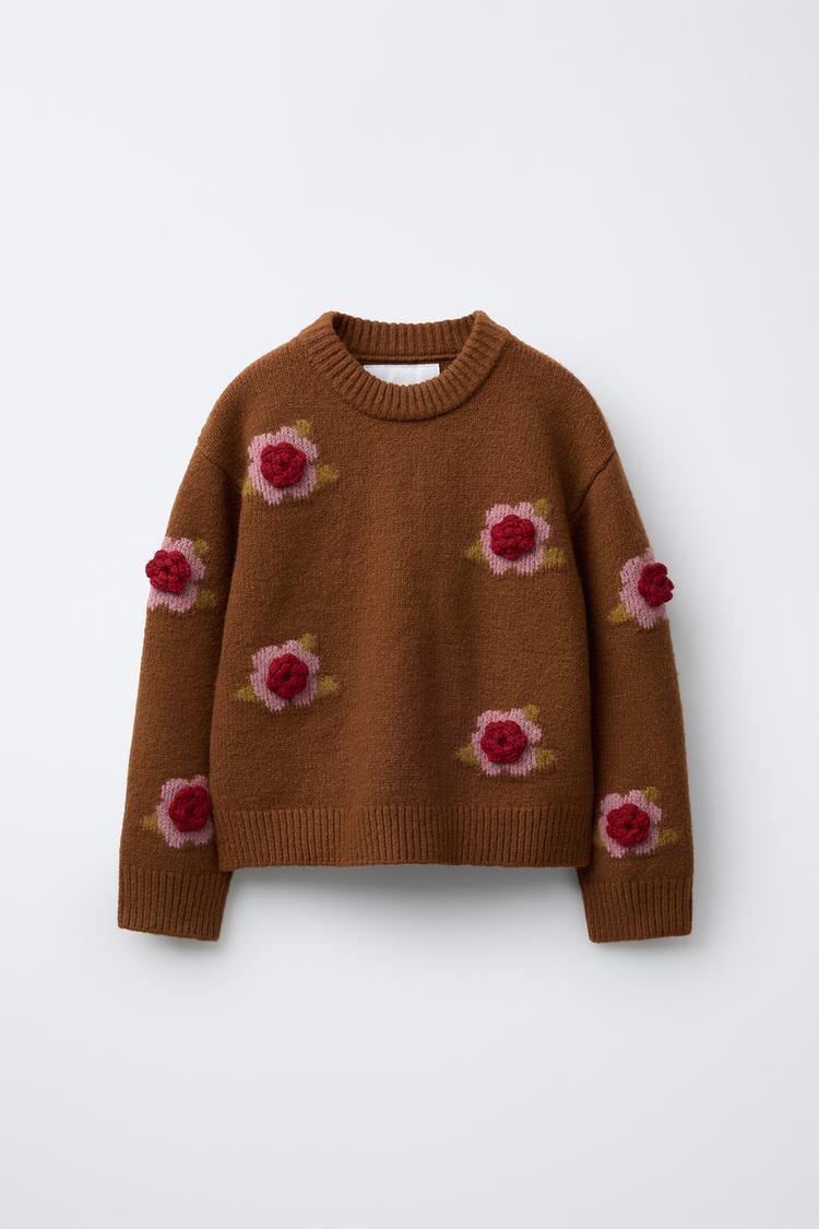ZARA ВЯЗАНЫЙ ДЖЕМПЕР С ЦВЕТОЧНЫМИ АППЛИКАЦИЯМИ, КАРАМЕЛЬНЫЙ