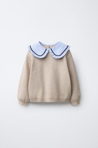 Вязаный джемпер с комбинированным воротником бобо, принтом в полоску и длинными рукавами. Застежка-капля на пуговице сзади.