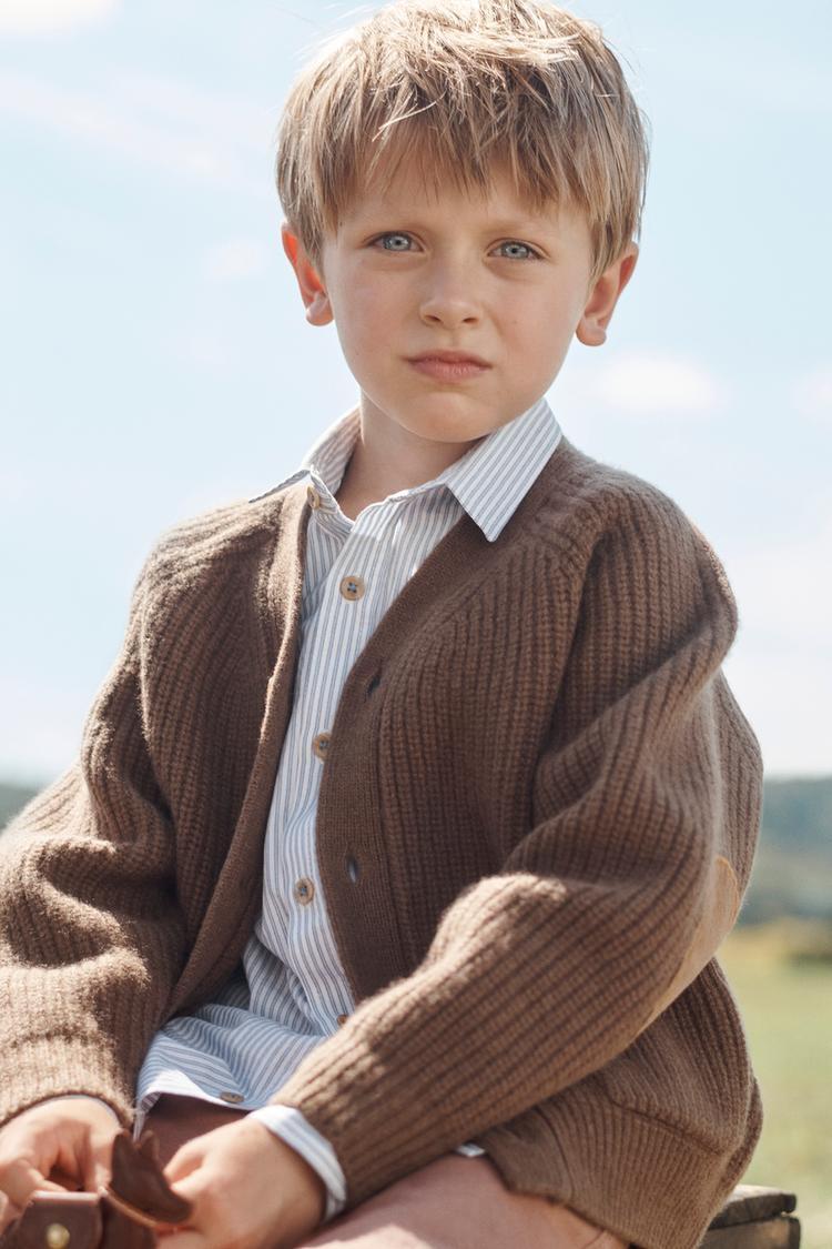 Вязаный кардиган с V-образным вырезом и длинными рукавами. На передней части есть пуговицы. Передние карманы с накладными карманами. На рукавах бархатные тканевые заплаты. 100% шерстяная ткань.