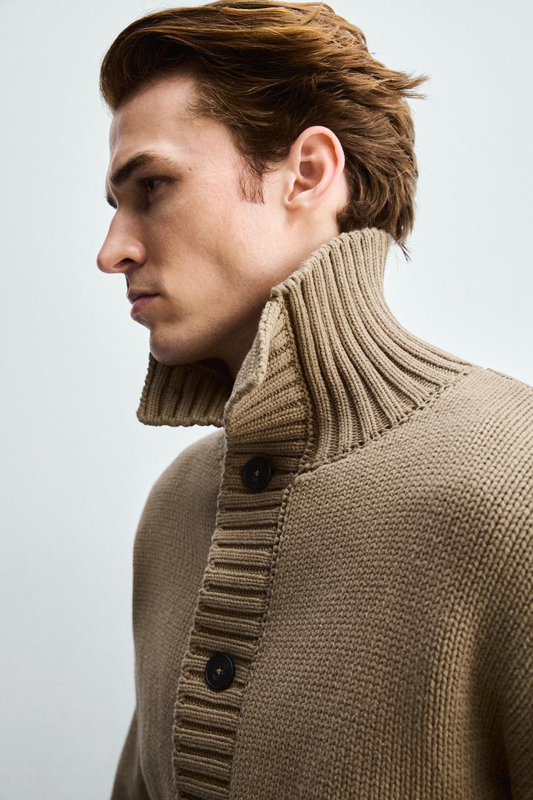 Кардиган свободного кроя из ткани с хлопком. Воротник-стойка и длинные рукава. Прорезные карманы на бедрах. Отделка в рубчик. Застежка на пуговицы спереди.