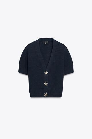 ZARA ВЯЗАНЫЙ КАРДИГАН С ПУГОВИЦАМИ В ВИДЕ ЗВЕЗД, МОРСКОЙ СИНИЙ