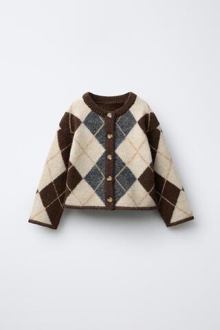 ZARA ВЯЗАНЫЙ КАРДИГАН С УЗОРОМ «РОМБЫ», ШОКОЛАДНЫЙ