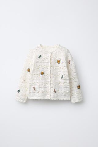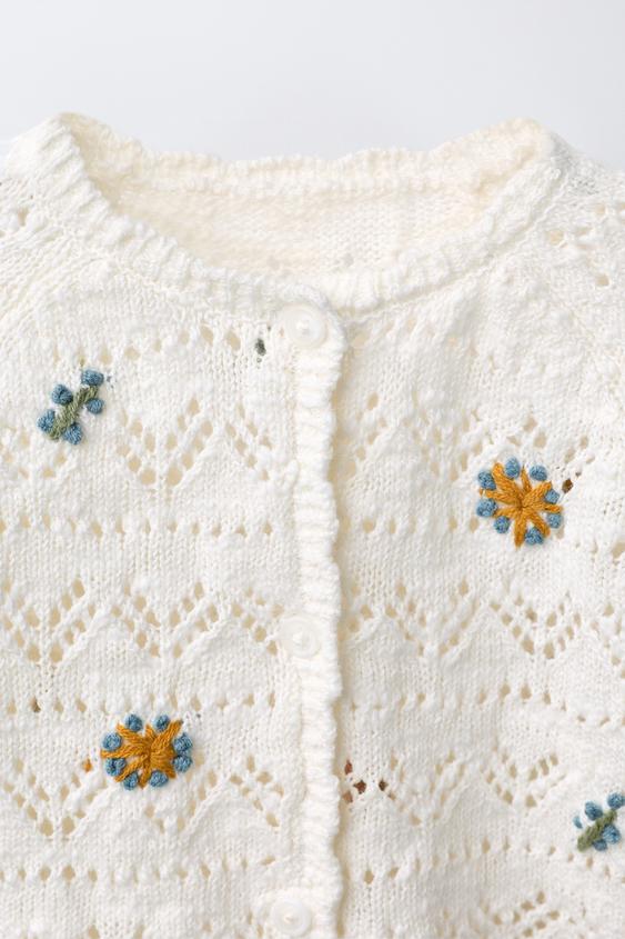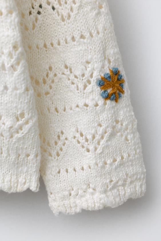 ZARA ВЯЗАНЫЙ КАРДИГАН С ВЫШИВКОЙ В ВИДЕ ЦВЕТОВ, ЭКРЮ