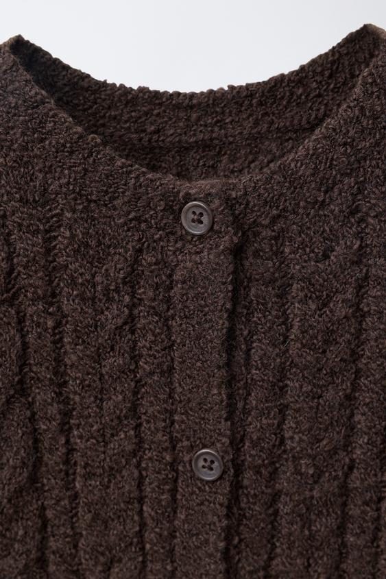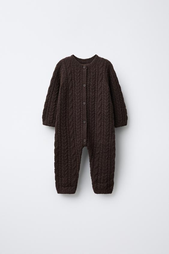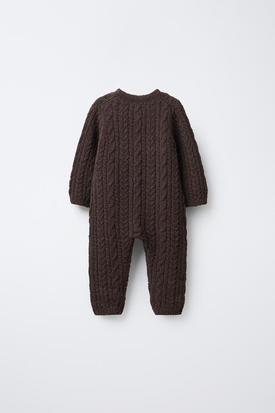 ZARA ВЯЗАНЫЙ КОМБИНЕЗОН С УЗОРОМ «КОСЫ», ТЕМНО-КОРИЧНЕВЫЙ