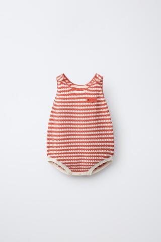 ZARA ВЯЗАНЫЙ КОМБИНЕЗОН В ПОЛОСКУ С ВЫШИВКОЙ РЫБКИ, ЭКРЮ
