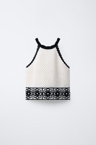 Вязаный крючком топ с воротником халтер и бретелями. Застежка на пуговицу в форме капли сзади. Декоративные цветы по низу.
