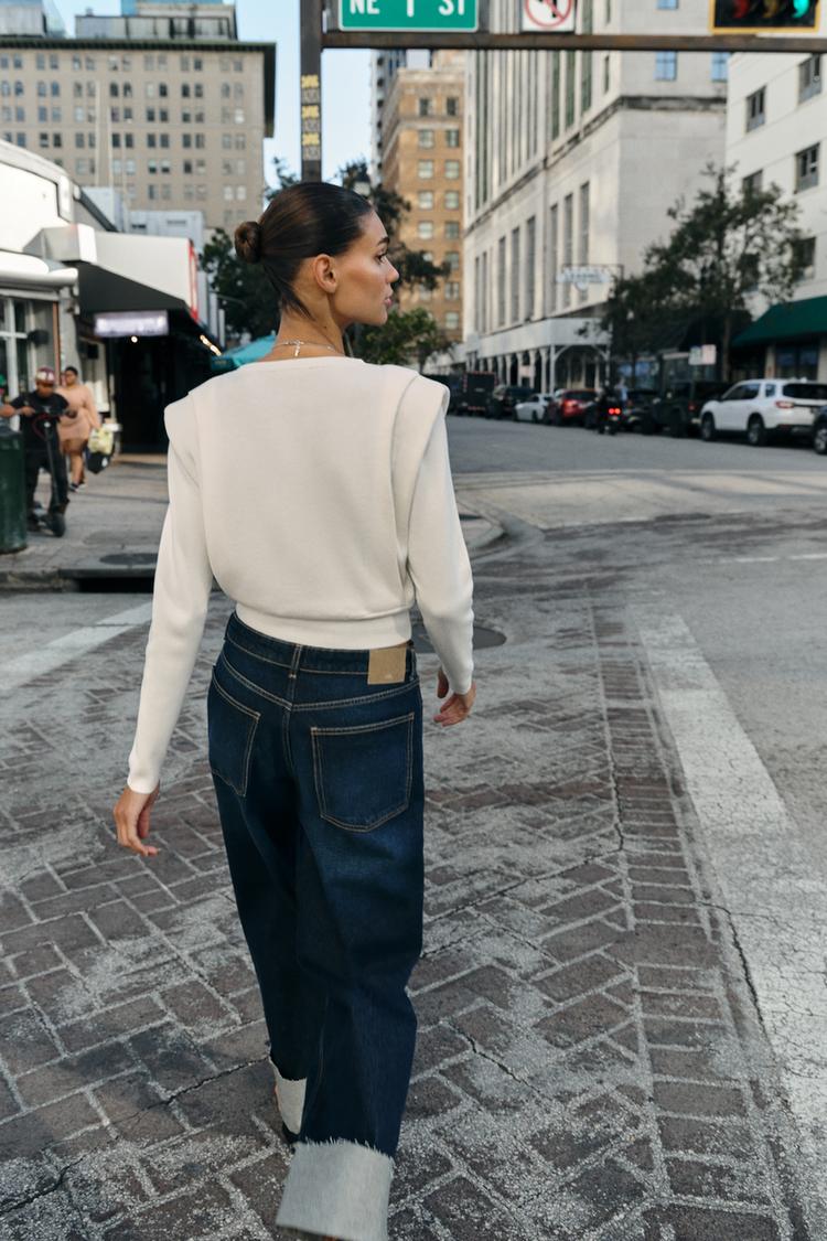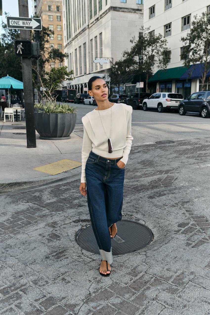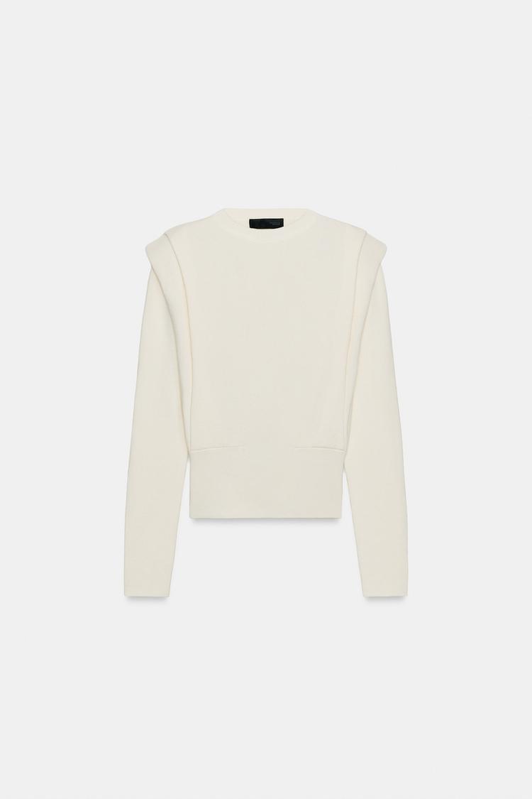 ZARA ВЯЗАНЫЙ СВИТЕР С ПОДПЛЕЧНИКАМИ, ЭКРЮ