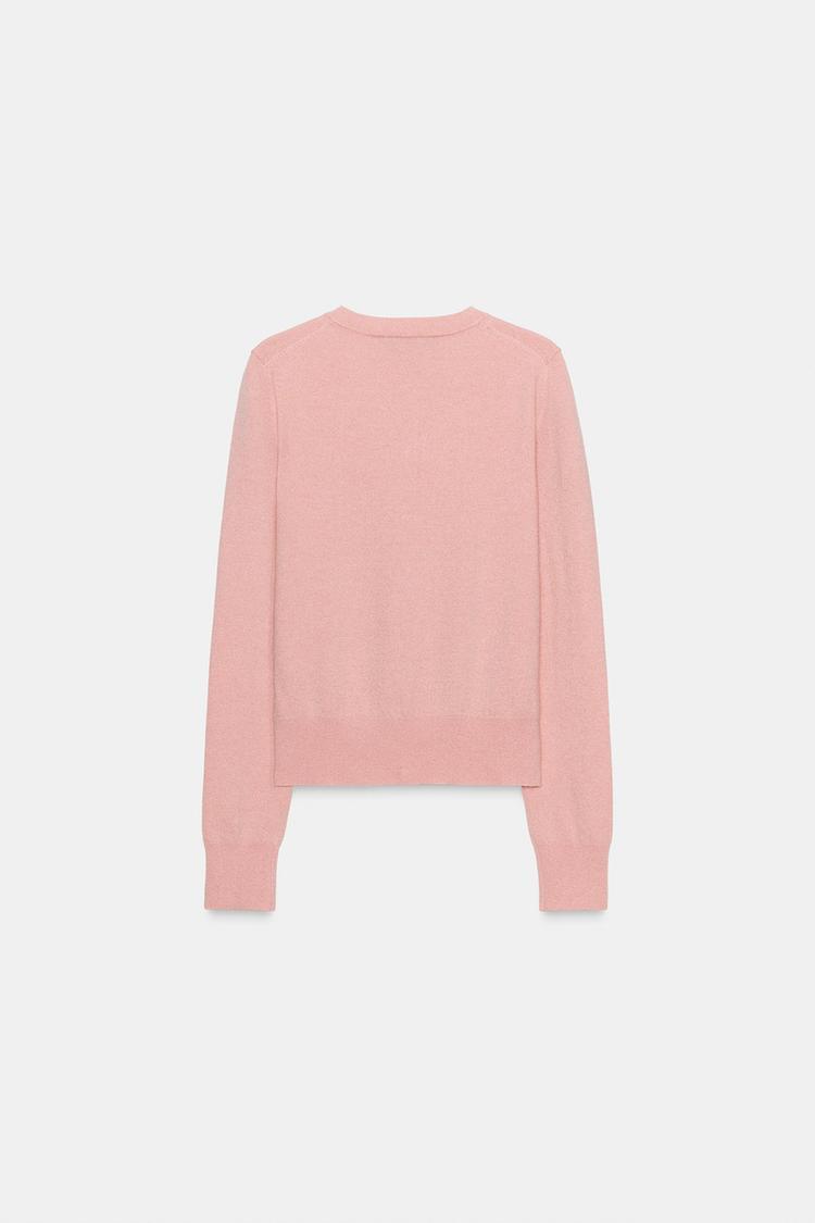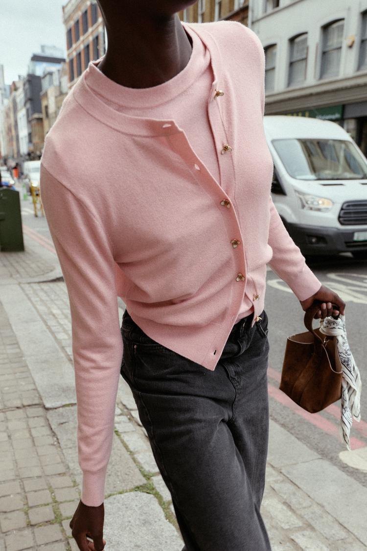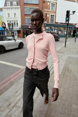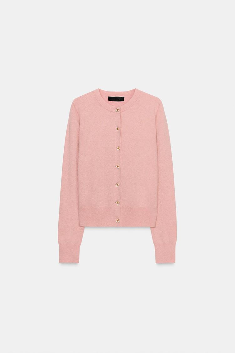ZARА ВЯЗАНЫЙ ЖАКЕТ С ЦВЕТОЧНЫМИ ПУГОВИЦАМИ, МЯГКИЙ РОЗОВЫЙ