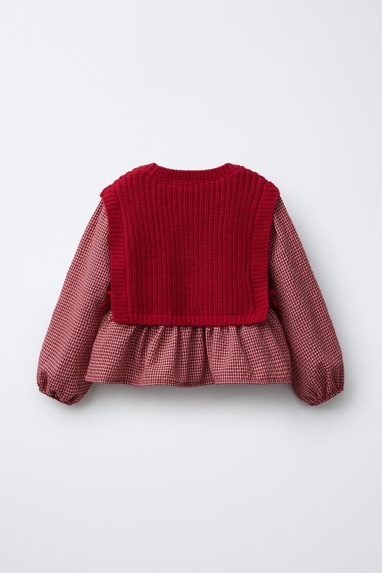 ZARA ВЯЗАНЫЙ ЖИЛЕТ ИЗ ШЕРСТИ С ВЫШИТОЙ РУБАШКОЙ, ТЕМНО-РОЗОВЫЙ