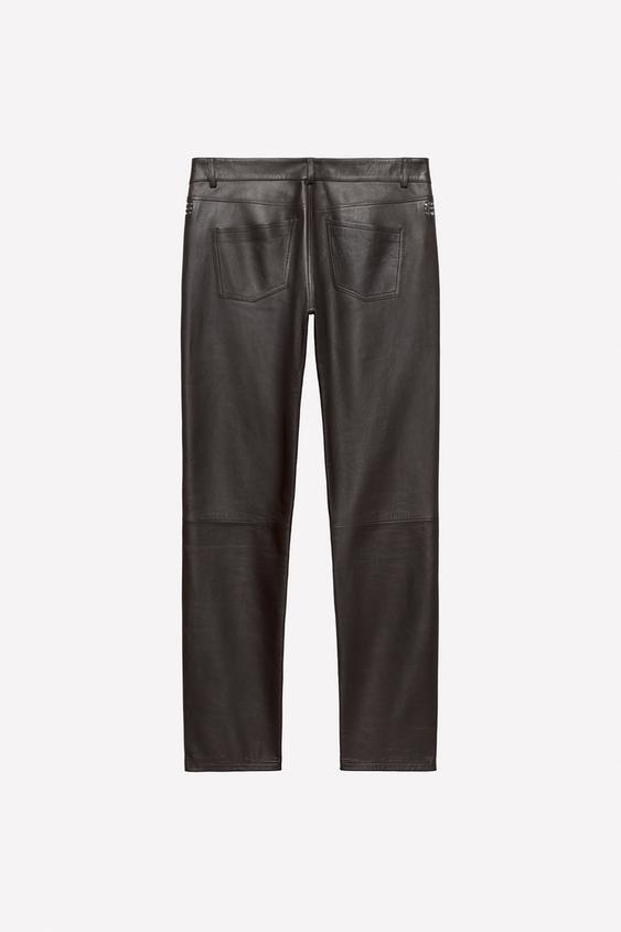 Брюки зауженного кроя из кожи наппа. Пять карманов. Металлическая аппликация в виде заклепок на боковой части бедра. Застежка на молнию и пуговицы.