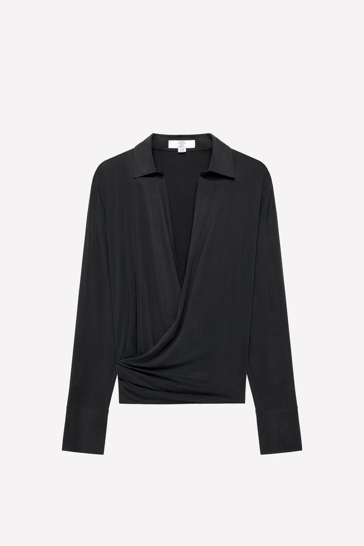 Рубашка свободного кроя из струящейся ткани с добавлением вискозы и эластана. С воротником с лацканами и разрезом спереди, а также длинными рукавами с манжетами на пуговицах. Застежка на пуговицы сбоку.