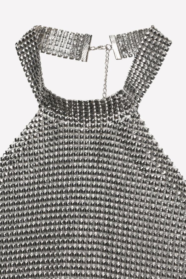 Топ на бретелях из металлической сетки. Открытая спина. Регулируемая застёжка на шее с помощью карабина.