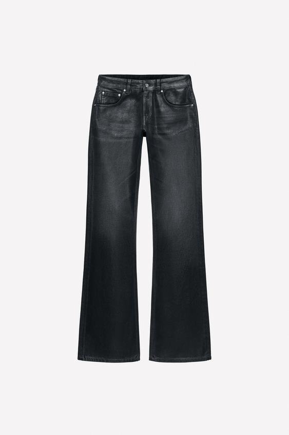 Джинсы расклешенного кроя из хлопкового денима с блестящей вощеной отделкой. Пять карманов. Застежка на молнию и пуговицу спереди.