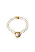 Многорядное ожерелье с искусственными жемчужинами, вышитыми металлическими элементами и контрастными деталями из искусственного жемчуга. С застежкой-кнопкой.