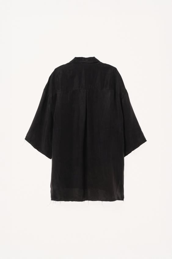 Рубашка оверсайз-кроя из струящейся ткани из смеси меди и вискозы. С воротником с лацканами и короткими рукавами. Асимметричный низ с боковыми разрезами. Нерегулярная отделка. Застежка спереди на пуговицы. Специальная коллекция Willy Chavarria x Zara.