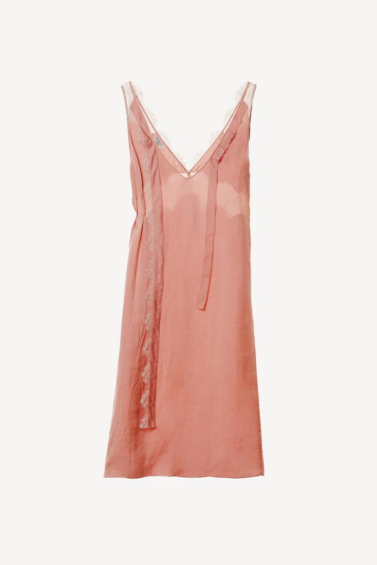 Платье-слип из ткани Cupro. С регулируемым V-образным вырезом на шнуровке и широкими бретелями. С кружевной аппликацией в тон ткани. Прямой подол.