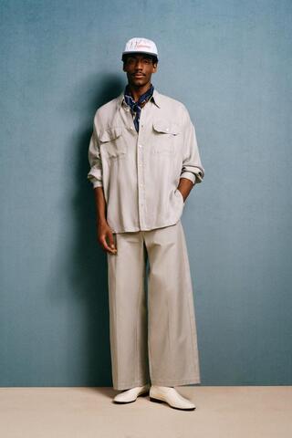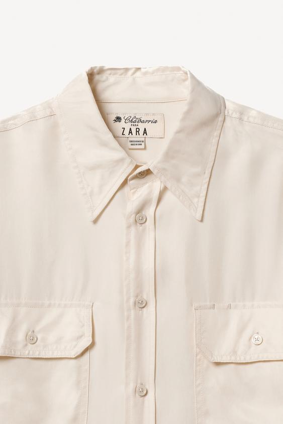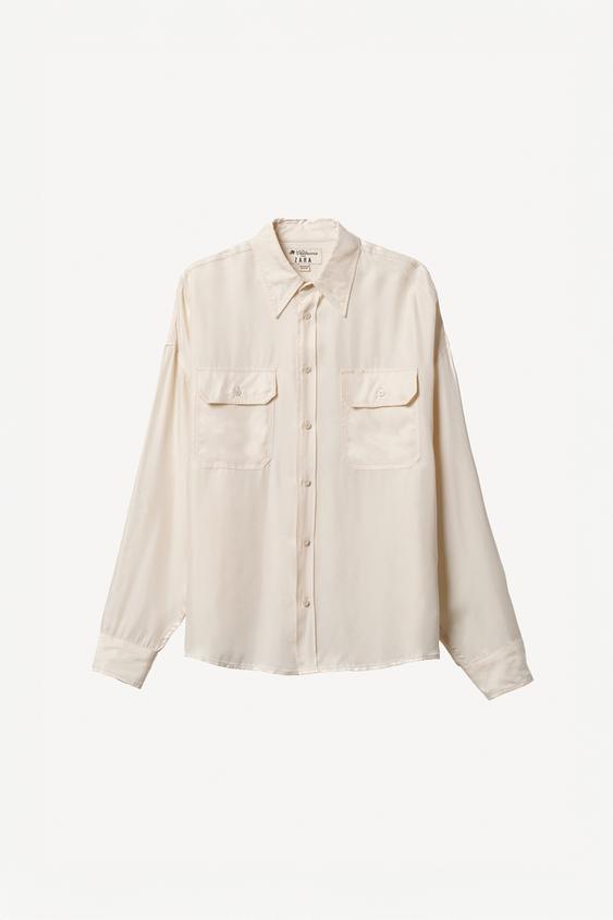 Рубашка свободного кроя из струящейся ткани из смеси меди и вискозы. Воротник с лацканами, длинные рукава с манжетами на пуговицах, накладные карманы с клапанами спереди и застежка на пуговицы спереди. Специальная коллекция Willy Chavarria x Zara.