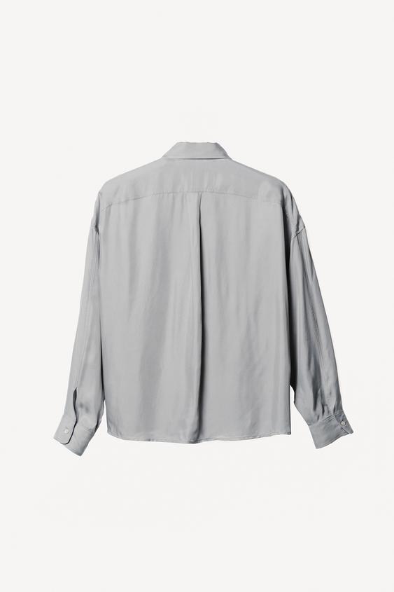 Рубашка свободного кроя из струящейся ткани из смеси меди и вискозы. Воротник с лацканами, длинные рукава с манжетами на пуговицах, накладные карманы с клапанами спереди и застежка на пуговицы спереди. Специальная коллекция Willy Chavarria x Zara.