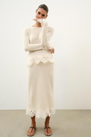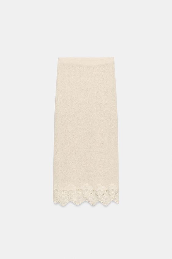 ZARA ЮБКА ИЗ ТКАНИ РУСТИК С КРУЖЕВОМ КРОШЕ, ПЕСОЧНЫЙ