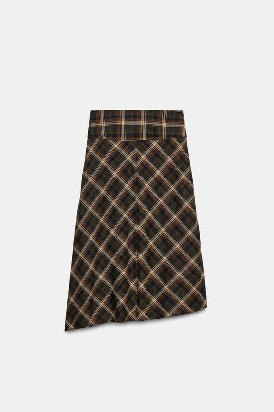 ZARA ЮБКА МИДИ АСИММЕТРИЧНАЯ В КЛЕТКУ, ТЕМНЫЙ ХАКИ
